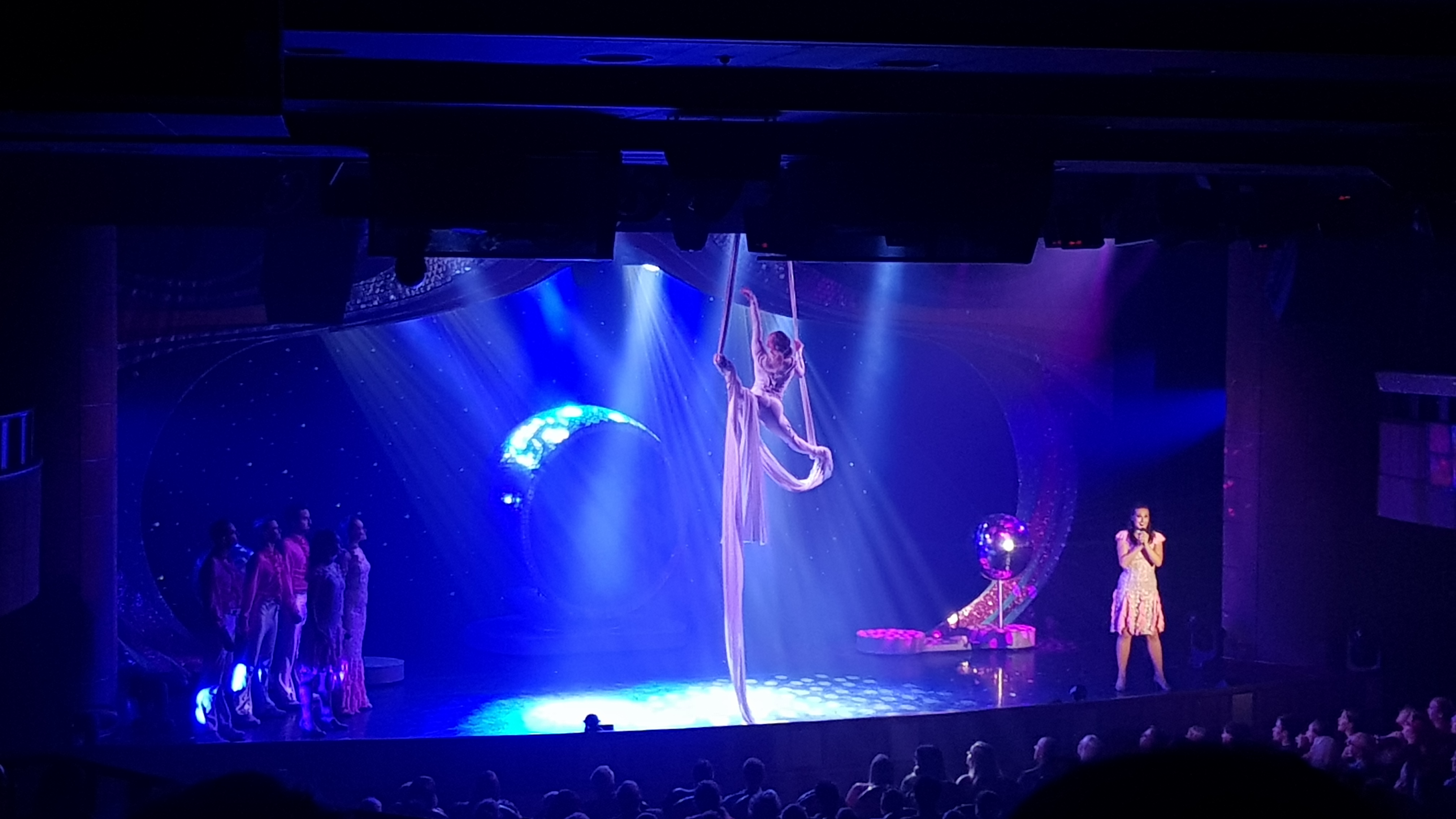 We weren’t sure what to expect of the show having experienced (and sometimes suffered through) performances of varying quality on previous cruises. Tonight’s show was performed by the ship’s singers and dancers and had a ‘boogie’ theme. Overall, we felt the show was very good quality. The singing wasn’t the very best I’ve heard but it was still good and the dances, costumes and sets were all excellent. We were also really impressed by the appearance of an acrobat who climbed, dangled from and threw herself around on what looked like flimsy, silk scarves suspended from the ceiling. We will definitely take a look at another show in the theatre later on in the cruise.