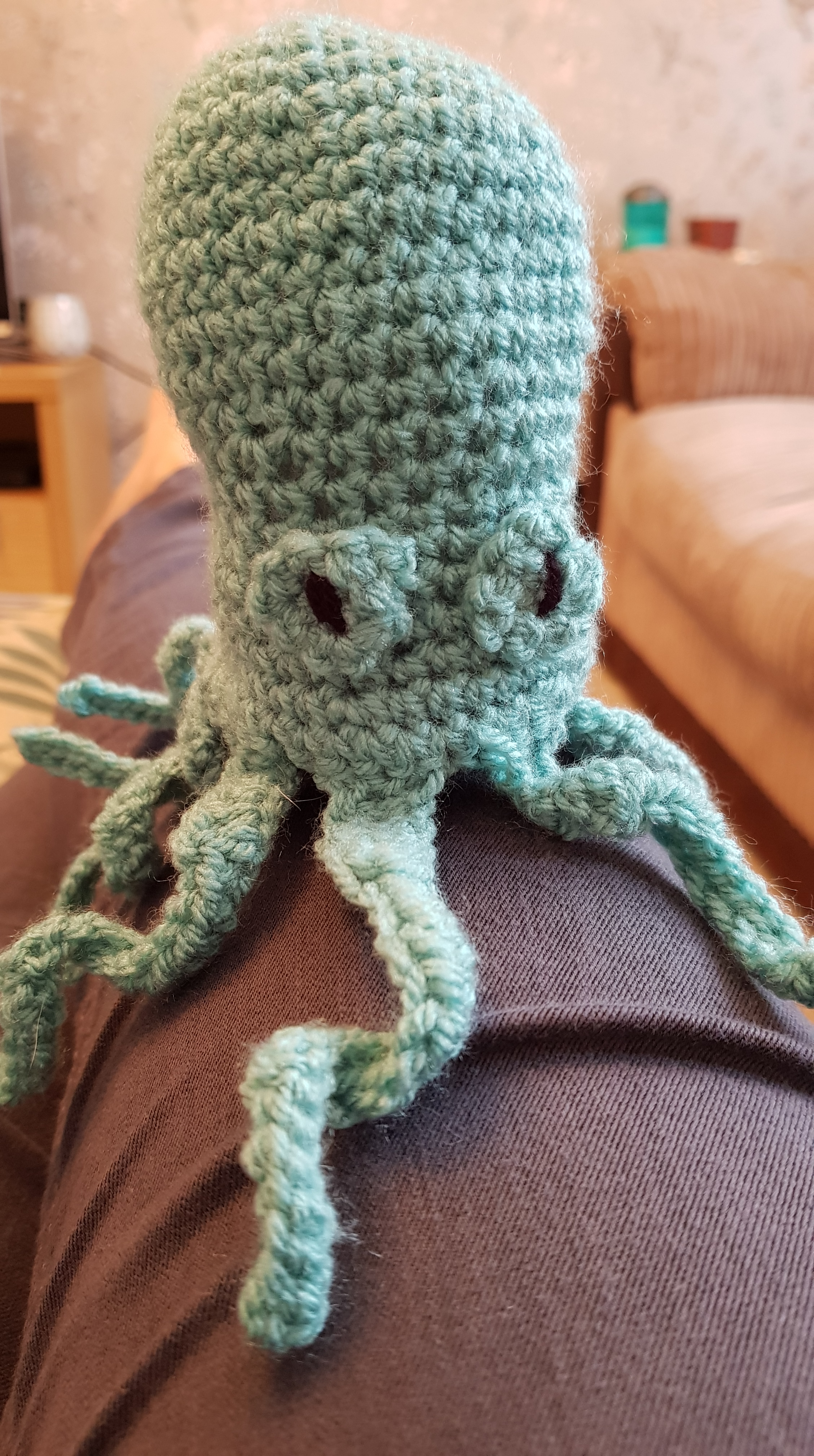 I’m pleased to say that, with the help of my friend in teaching me to read the pattern, my mum who helped me to count stitches and several YouTube videos, I eventually completed the pattern. Now, there are some mistakes (a couple of the legs are back-to-front but that doesn’t make him any less of an octopus) but I’m really proud that I managed to complete it. I can even count the stitches fairly reliably now. Well, I’m getting there anyway.