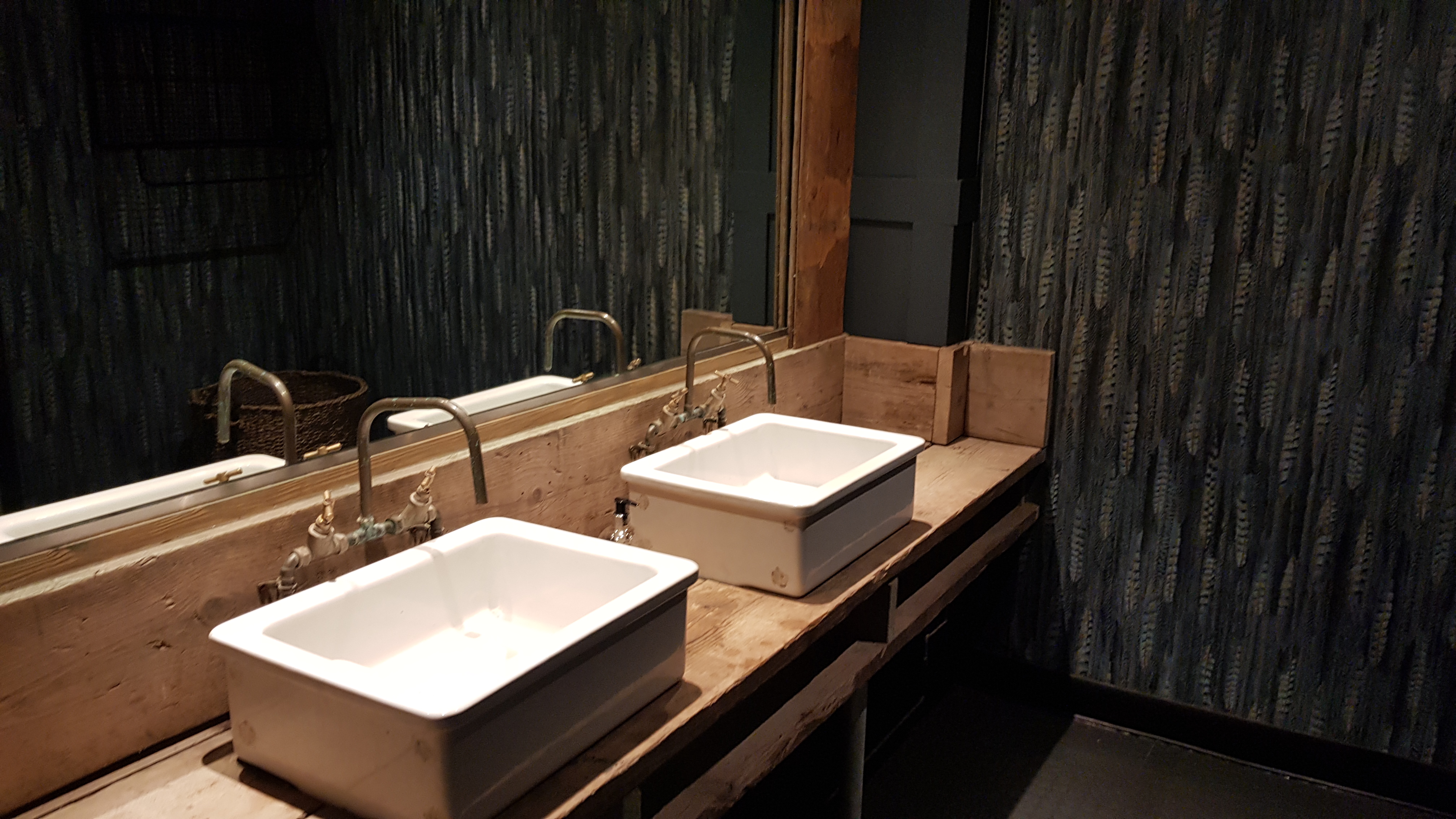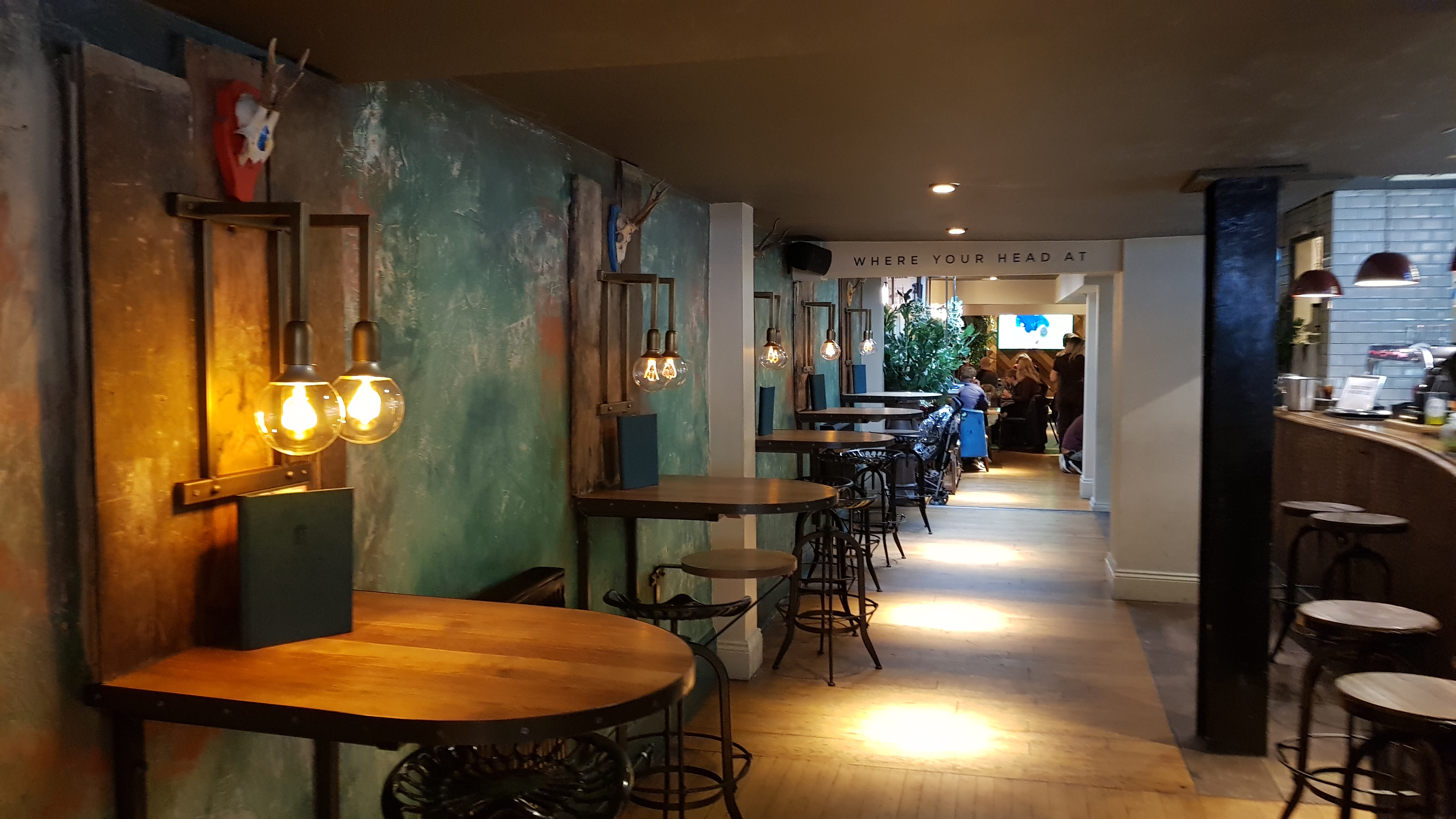 On entering, we immediately liked the industrial vibe with pallet wood, retro posters and subway tiles. These elements were softened by the use of circular, studded-leather banquets which put me in mind of Chesterfield sofas, velvet armchairs and curtains, crystal cut glasses, test-tubes of baby’s breath on the tables and a green foliage wall with twinkling fairy lights. Of course, Mr FFF took very little notice of these elements as the Ruby World Cup was being show on a big screen! Despite the sporting excitement, the atmosphere was very much one of relaxed sophistication.
